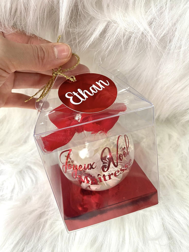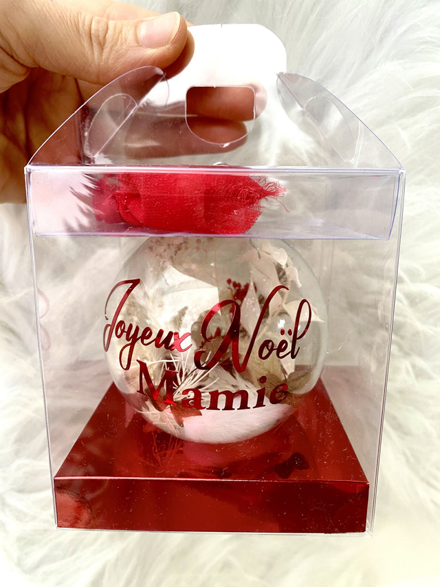 Boule de Noël en verre 8 cm - intérieur Fleurs séchées dans les tons Rouge et Blanc -Personnalisation Joyeux Noël Mamie en vinyle adhésif de couleur Rouge - socle en papier cartonné chrome Rouge -Emballage cadeau boîte transparente avec une étiquette et le prénom de votre enfant si vous le souhaitez. Une fois la commande validée, vous pouvez m’envoyer le prénom de votre enfant par mail à lescreas.emy@gmail.com ou dans l’onglet contactez nous en bas de la page Le délai de fabrication est de 3 jours . L’envoi s’effectue via la poste par colissimo à domicile en 48h. Si vous avec une question ou une demande particulière, vous pouvez m’envoyer un e-mail , je vous répondrai avec plaisir !